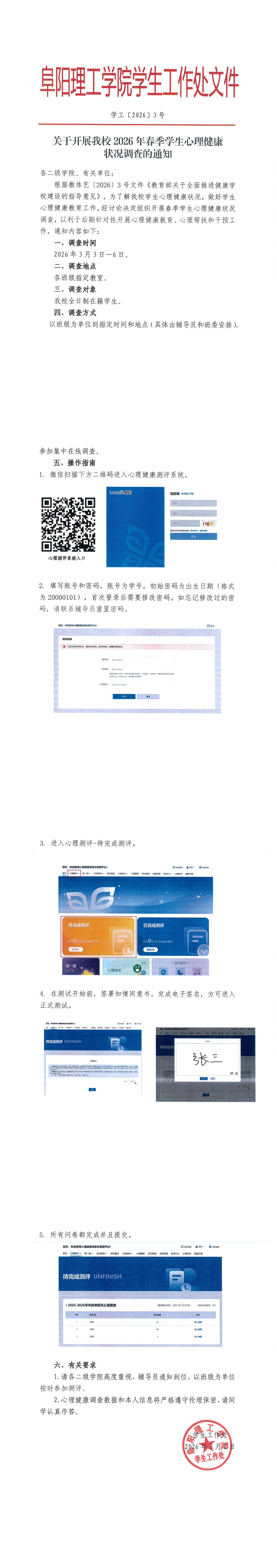 学工处:关于开展我校2026年春季学生心理健康状况调查的通知