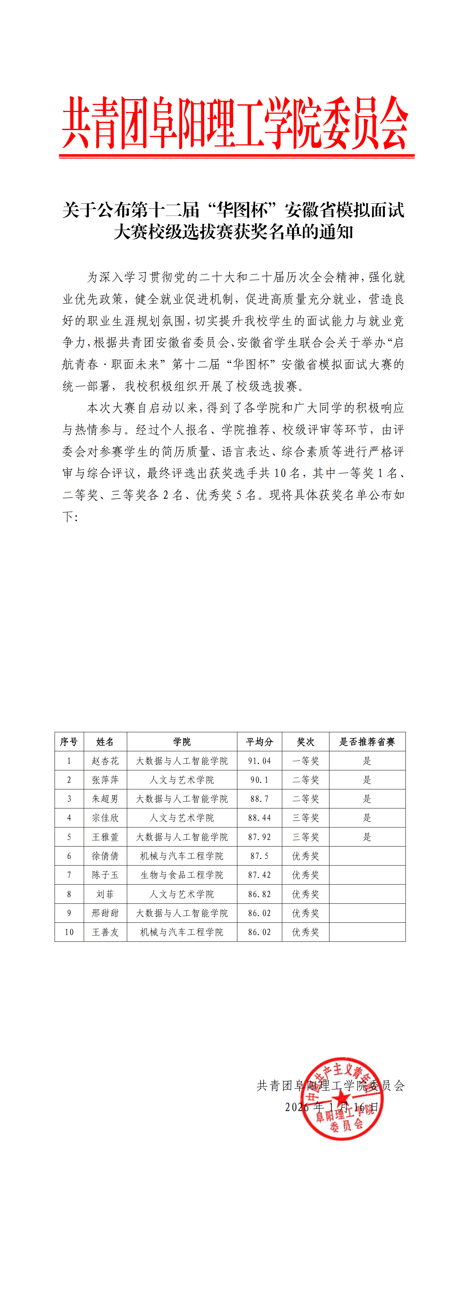 校团委:关于公布第十二届“华图杯”安徽省模拟面试 大赛校级选拔赛获奖名单的通知