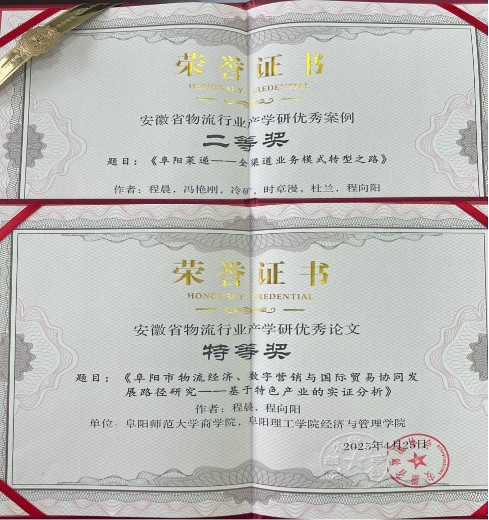 The theme of this conference is "Smart Logistics and Supply Chain Innovation and Development". Leaders and experts from China Federation of Logistics and Purchasing, China Transportation Association, Anhui Provincial Department of Industry and Information Technology, Provincial Department of Commerce, and more than 500 representatives from logistics companies, research institutes and 29 universities across the province attended the conference. The paper "Research on the Coordinated Development Path of Logistics Economy, Digital Marketing and International Trade in Fuyang City - Empirical Analysis Based on Characteristic Industries" submitted by our faculty team won the "Special Prize for Excellent Papers in Industry-University-Research Cooperation in Logistics Industry in Anhui Province", and the case "Fuyang Caidi - The Road to Transformation of Omni-channel Business Model" won the "Second Prize for Excellent Cases in Industry-University-Research Cooperation in Logistics Industry in Anhui Province". The research content focuses on the coordinated development of local logistics economy, digital marketing and international trade, and provides theoretical support and practical paths for the optimization of the characteristic agricultural industry chain in northern Anhui.