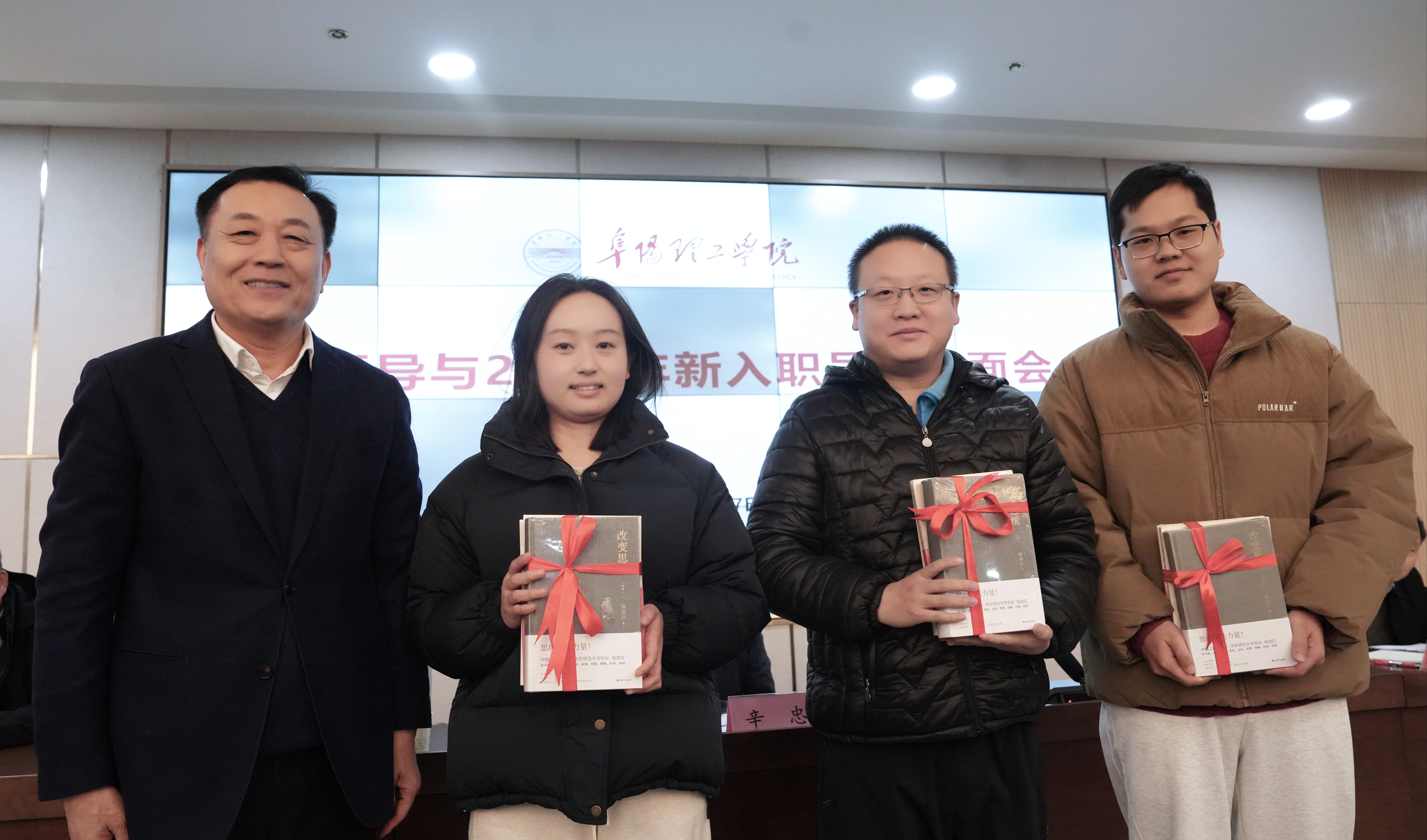随后,刁卫华为新入职教师代表李家良、王梦文、计鹏飞赠送了《论教育》《百年大党旗正红——“七一勋章”获得者风采录》《改变思维》等书籍,鼓励新入职教师要终身学习,好好工作,在新的工作岗位上做出贡献。