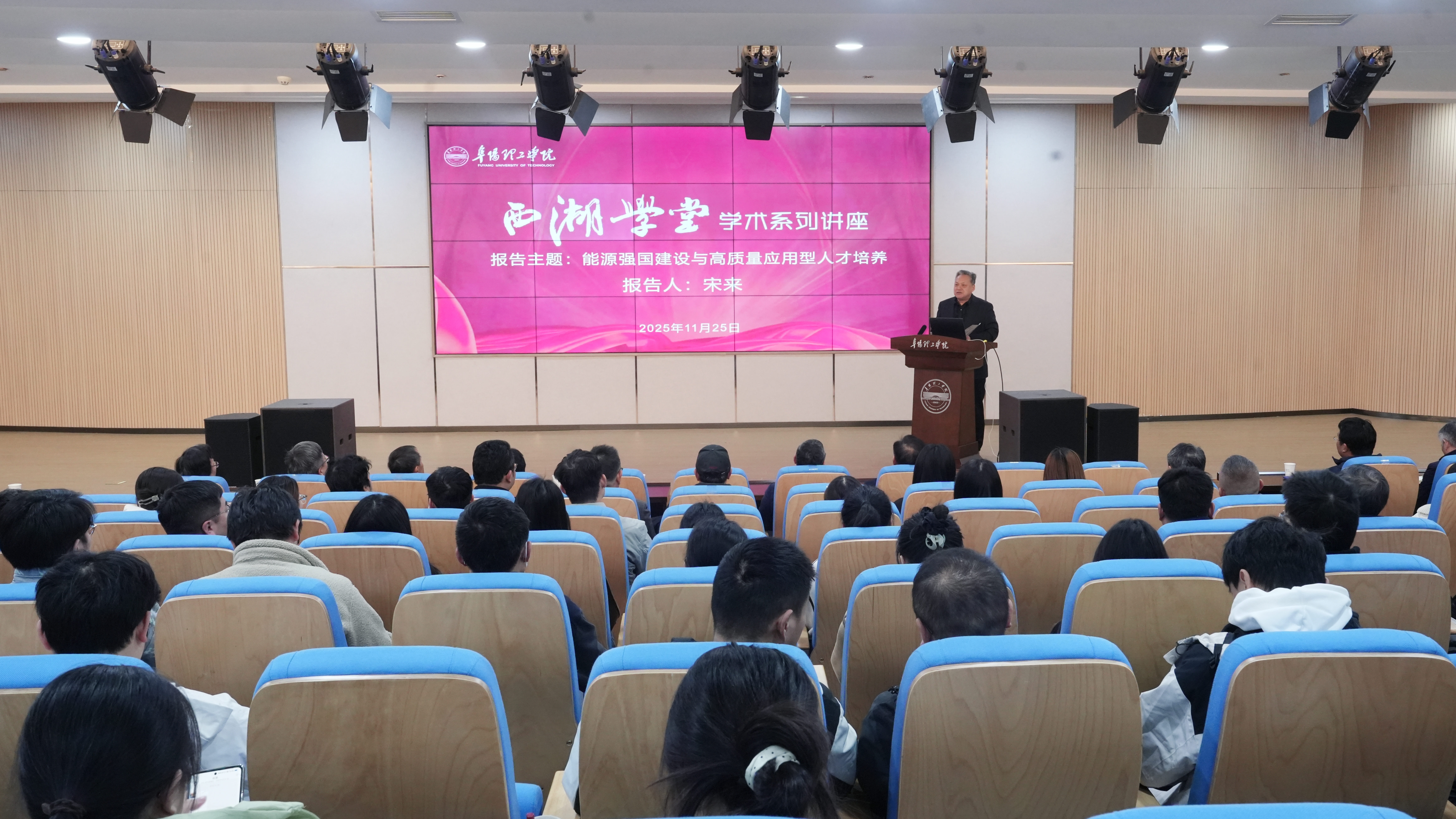 11月25日下午,我校“西湖学堂”学术系列讲座第十讲在图书馆一楼报告厅举行。本次讲座特别邀请了上海电力大学党委书记宋来以《能源强国建设与高质量应用型人才培养》为题作专题报告。校长辛忠主持报告会,校督导专员、党委书记刁卫华,副校长许志才、张效英、丁超,校长助理黄婕,纪委书记李成旭,相关单位负责人及师生代表等参加。