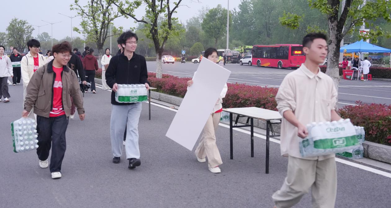 赛事当日凌晨,志愿者们身着统一服装,准时集结、奔赴岗位。从起点集结区、沿途赛道补给站点,到终点完赛区,处处可见阜理学子忙碌的身影。在补给站,他们高效有序分发食品、饮水等物资,分工明确、配合默契;在赛道沿线,他们坚守岗位、耐心指引,用呐喊与掌声为选手加油鼓劲;在人流密集区域,他们主动答疑、维持秩序,用微笑与贴心服务温暖每一位参赛者。
