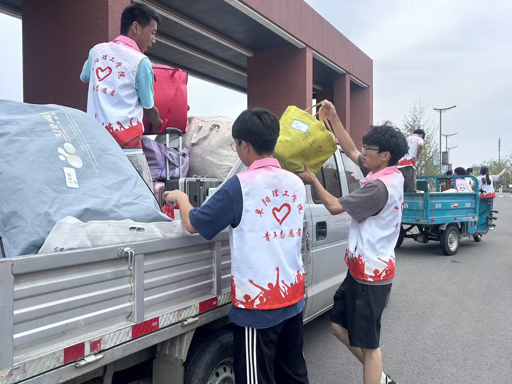 在迎新工作的各个环节,都能看到志愿者们忙碌的身影。在前期场地布置中,志愿者们齐心协力,搬运物资、进行校园迎新氛围营造、搭建帐篷、张贴指示牌,精心布置每一个迎新站点,为新生营造出温馨、有序的报到环境。