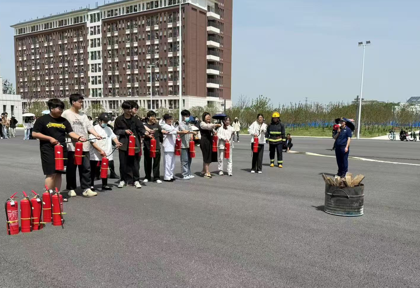 演练分为逃生疏散和灭火实操两个环节。随着警报声响起,各行动小组按既定流程开始演练。全体参训人员按照预定的疏散路线,用湿毛巾捂住口鼻、弯腰低姿,在工作人员指引下迅速、安全撤离至指定区域。整个疏散过程井然有序、迅速高效,为师生员工应对火灾疏散逃生提供了宝贵的实践经验。灭火实操环节中,消防大队张教官结合近年来阜阳市发生的火灾典型案例,围绕"预防、报警、自救"三大核心,系统讲解一系列消防安全知识,并现场演示干粉灭火器"提、拔、握、压"四步操作法及消防过滤式自救呼吸器佩戴技巧。。参训人员踊跃参与实操体验,初步掌握灭火器的使用技巧和灭火要领。