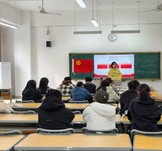 活动在庄严的团歌声中拉开帷幕。团支书张刘玲首先带领大家回顾“一二·九”运动历史脉络,通过展示1935年北平学生游行的珍贵历史照片和街头学生向民众演讲抗日主张的片段,生动再现1935年青年学子挺身而出、救亡图存的热血场景,深刻阐释运动背后蕴含的爱国情怀与民族担当,让团员们真切感悟先辈们为民族大义拼搏奋斗的精神内核。