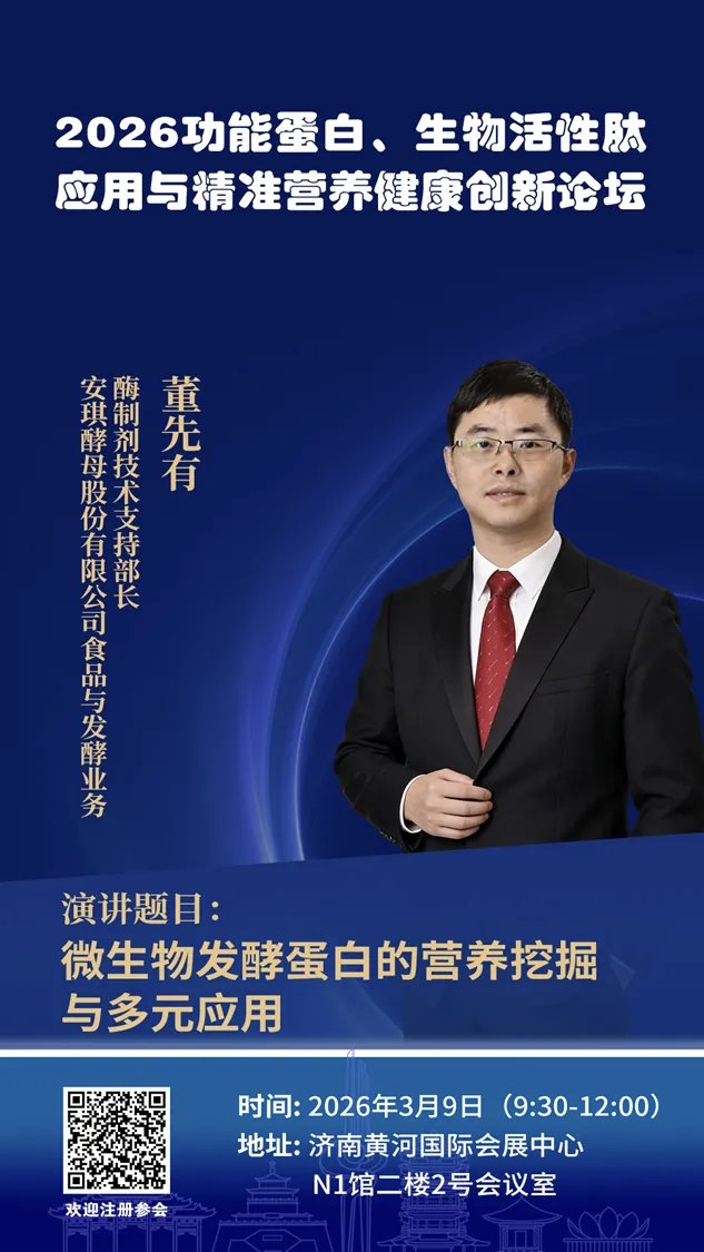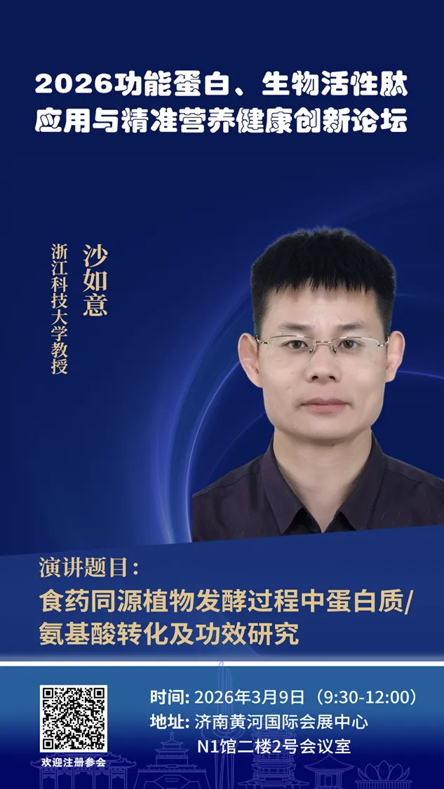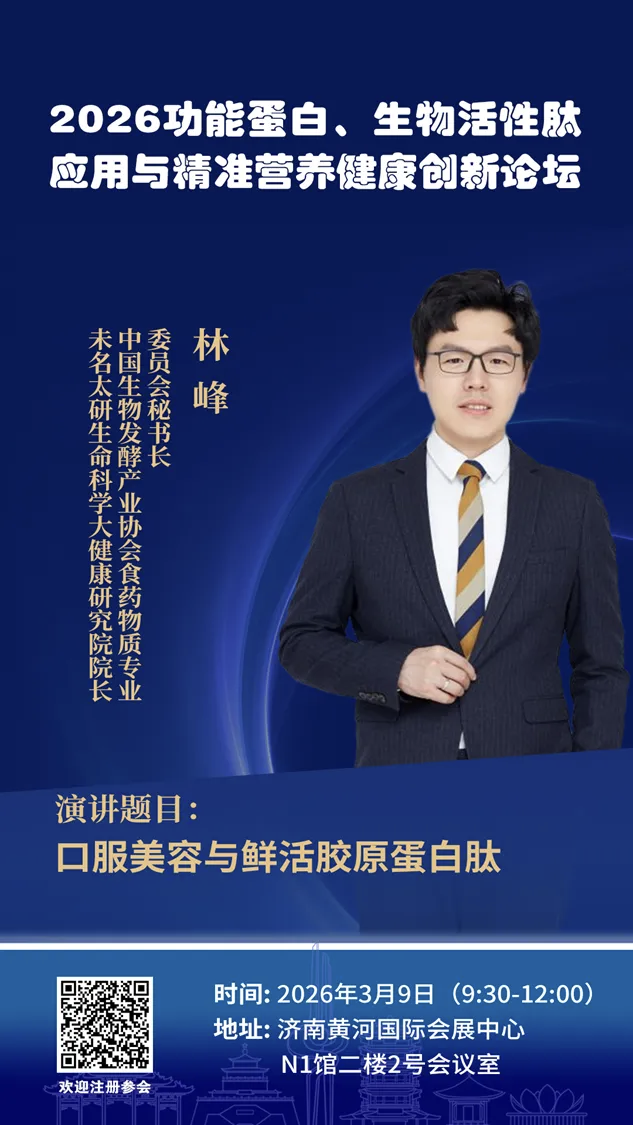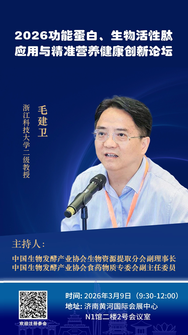 随着“健康中国”战略的深入推进与大健康产业的持续升级,功能蛋白与生物活性肽的研究与应用正迈入以“精准化、个性化、高效化”为核心的新阶段。为紧跟科技前沿、把握市场脉搏,推动产业从“规模增长”向“价值创新”转型,聚焦前沿热点与未来需求,特举办“2026功能蛋白、生物活性肽与精准营养健康创新论坛”。论坛将深度探讨精准营养、合成生物学创新应用、功能评价新体系及产业融合新业态,旨在搭建一个高水平、前瞻性的产学研用交流与合作平台。论坛定于2026年3月9日在济南黄河国际会展中心召开,具体事宜通知如下: