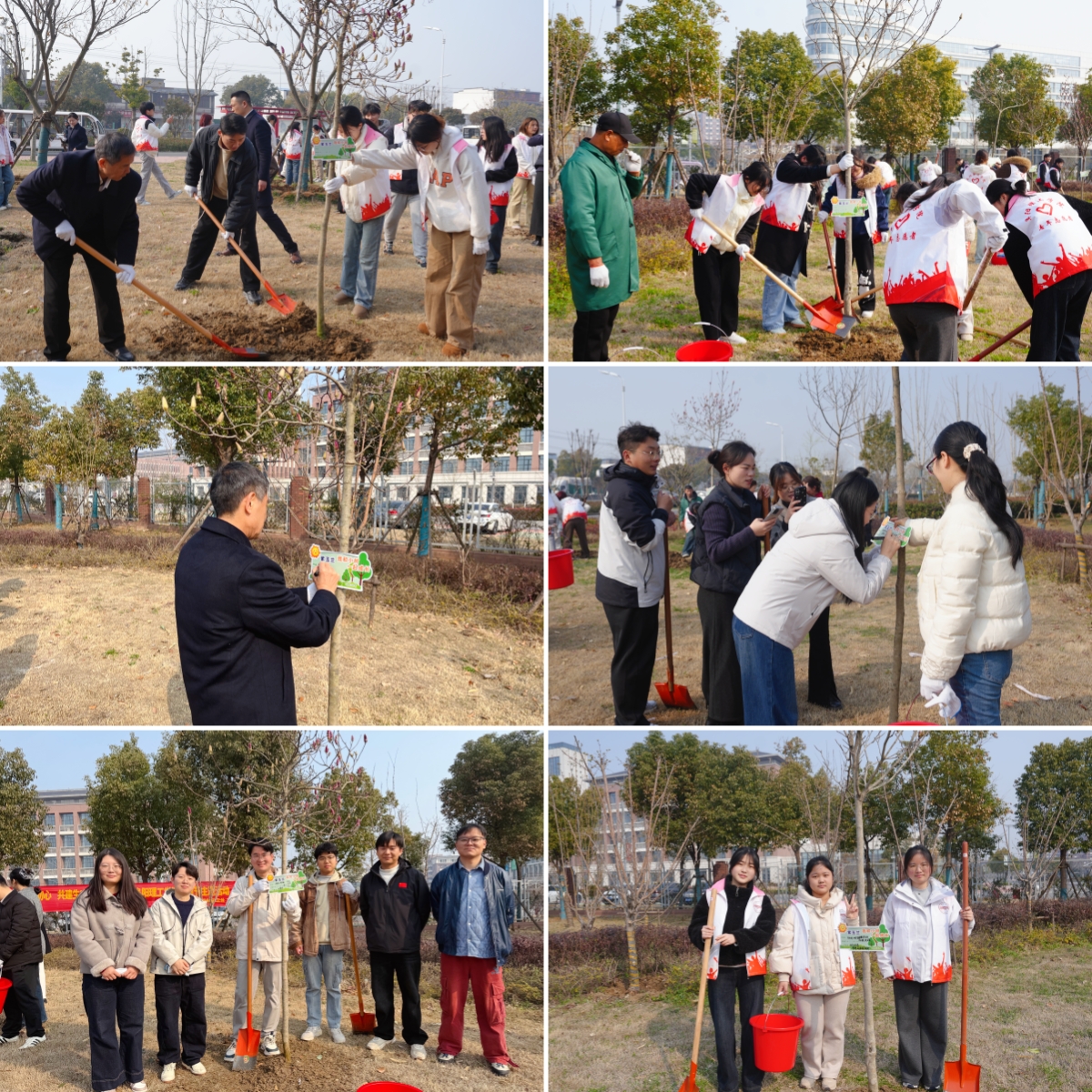 植树现场氛围热烈、秩序井然,大家分工协作、配合默契,按照技术要点完成挥锹挖坑、浇水定根等流程。经过共同努力,25株树苗整齐地矗立在南门外草坪上,为初春的校园增添了一抹鲜亮的生机。植树完成后,志愿者们纷纷为自己栽种的树苗挂上专属标签,与小树合影留念,记录下这个充满意义的时刻。