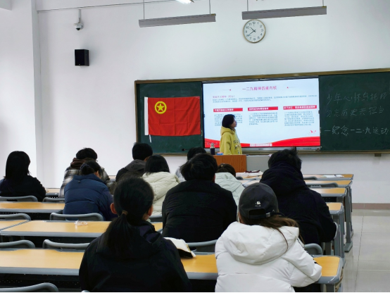 活动在庄严的团歌声中拉开帷幕。团支书张刘玲首先带领大家回顾“一二·九”运动历史脉络,通过展示1935年北平学生游行的珍贵历史照片和街头学生向民众演讲抗日主张的片段,生动再现1935年青年学子挺身而出、救亡图存的热血场景,深刻阐释运动背后蕴含的爱国情怀与民族担当,让团员们真切感悟先辈们为民族大义拼搏奋斗的精神内核。