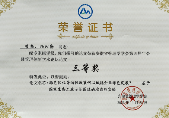 在本次论坛中,我院2023级财务管理专业本科生李梅(指导教师:杨树勤)撰写的论文《绿色区位导向性政策何以赋能企业绿色发展?——基于国家生态工业示范园区的准自然实验》经专家评审,荣获论坛论文三等奖。该研究聚焦于绿色政策对企业可持续发展的驱动机制,以国家生态工业示范园区为案例,通过准自然实验方法,实证分析了政策对企业绿色转型的影响路径,为区域绿色经济发展提供了理论参考与实践建议。
