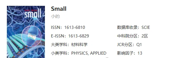 推荐理由:该刊是Wiley旗下纳米与微尺度领域顶刊,JCR Q1、中科院2区TOP,2024-2025影响因子 12.1,自引率仅 5%。聚焦多学科交叉研究,初审约13天,全流程2-3个月,认可度高,是材料、化学等领域优质选择。